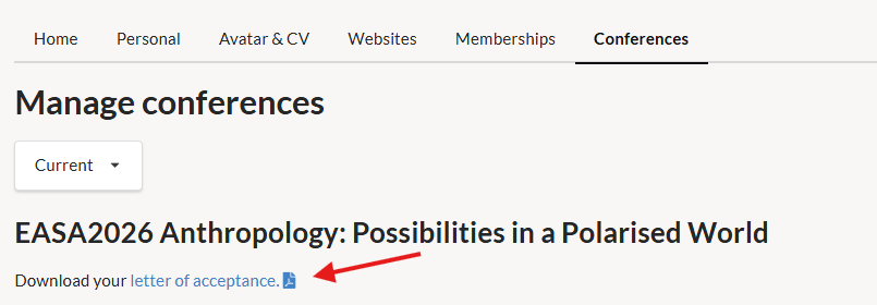 Acceptance letters are available on each person’s account if their paper or panel has been accepted for EASA2026. The aceptance letters are designed to help with institutional funding applications, time off work, and proof of acceptance for other related reasons.