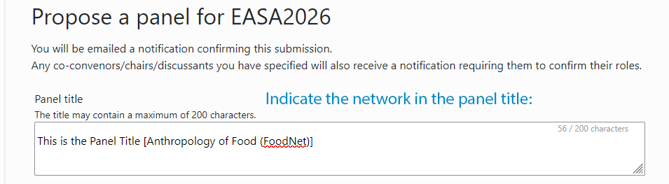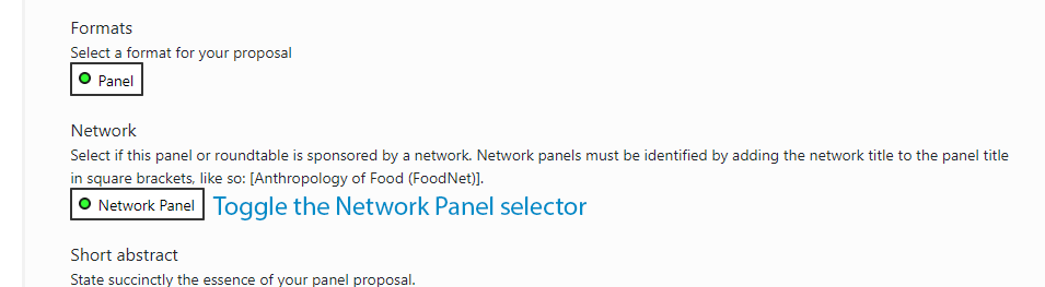 At the point of panel proposing, network panels must be identified by a) adding the network title to the panel title in square brackets, like so: [Anthropology of Food (FoodNet)], and b) clicking on the “network” tag button.