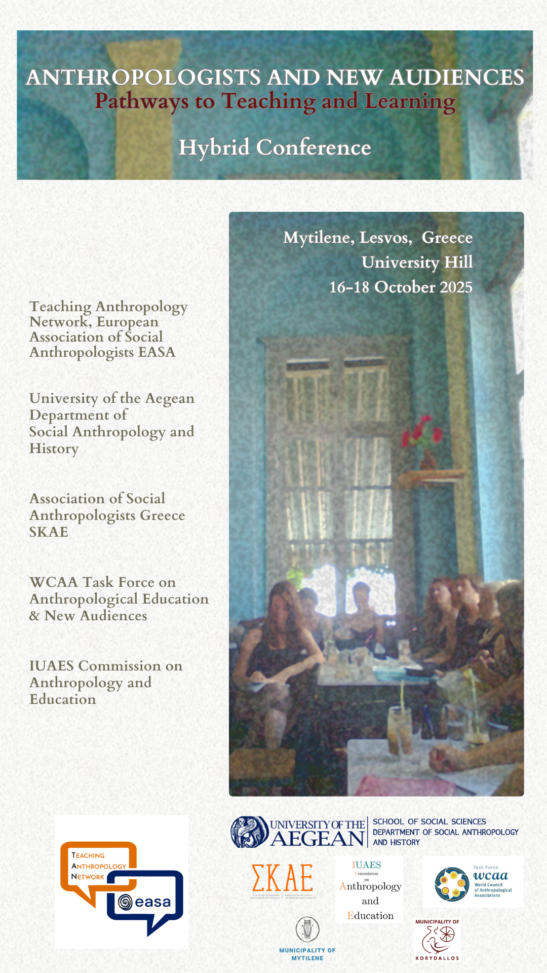 We sincerely thank you for your cooperation and attention. We look forward to your active and constructive participation, which will further strengthen anthropological education in today’s global context. This effort is made possible through your contributions, starting from places often considered peripheral, such as Mytilene on the island of Lesbos, which will serve as the welcoming center of our discussions for three days.