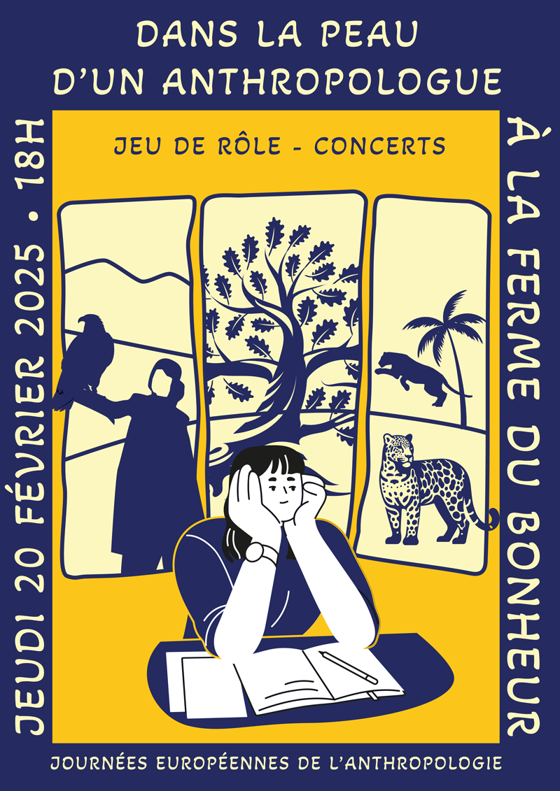 As part of the European Anthropology Days, we invite you on Thursday February 20, 2025 6 pm at La Ferme du Bonheur (Happiness Farm), on the campus of the University of Nanterre, to take part in a role-playing game inspired by the research fields of young masters in anthropology. Participants will have the opportunity to step into the shoes of an anthropologist and resolve dilemmas encountered during ethnographic work. Three games will be offered: The head in the Clouds on learning falconry in Kyrgyzstan, At the foot of a tree on sacred trees in Bali, and On the trail of the jaguars on the cohabitation between breeders and big cats in French Guiana. The event will begin at 6 p.m. with three 30-minute gaming sessions, interspersed with live musical interludes by our fellow students anthropologists/musicians. We will end the evening with a festive and dancing moment, animated by a playlist created by doctoral students in connection with their research work.