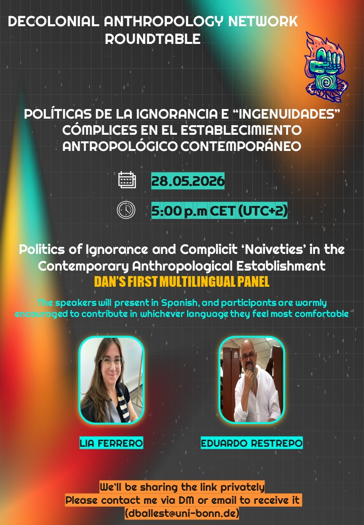 This roundtable will examine how anthropological knowledge is shaped by institutional structures, hierarchies, and material conditions that reproduce unequal power relations. It questions the supposed neutrality of the discipline, highlighting how silences and “innocent” practices often sustain dominant epistemologies. The discussion calls for a more engaged and politically aware anthropology that challenges these dynamics and rethinks where and for whom knowledge is produced.